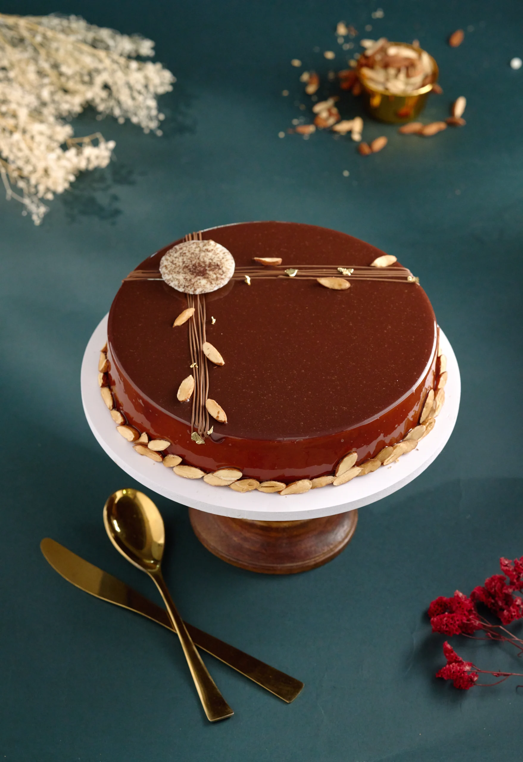 Experience the perfect has many of rich almond sponge with roasted almand and dark Belgium chocolate (cocoa solids 33.6%) fresh dairy cream. A flawless high-gloss mirror glaze for a string professional shine