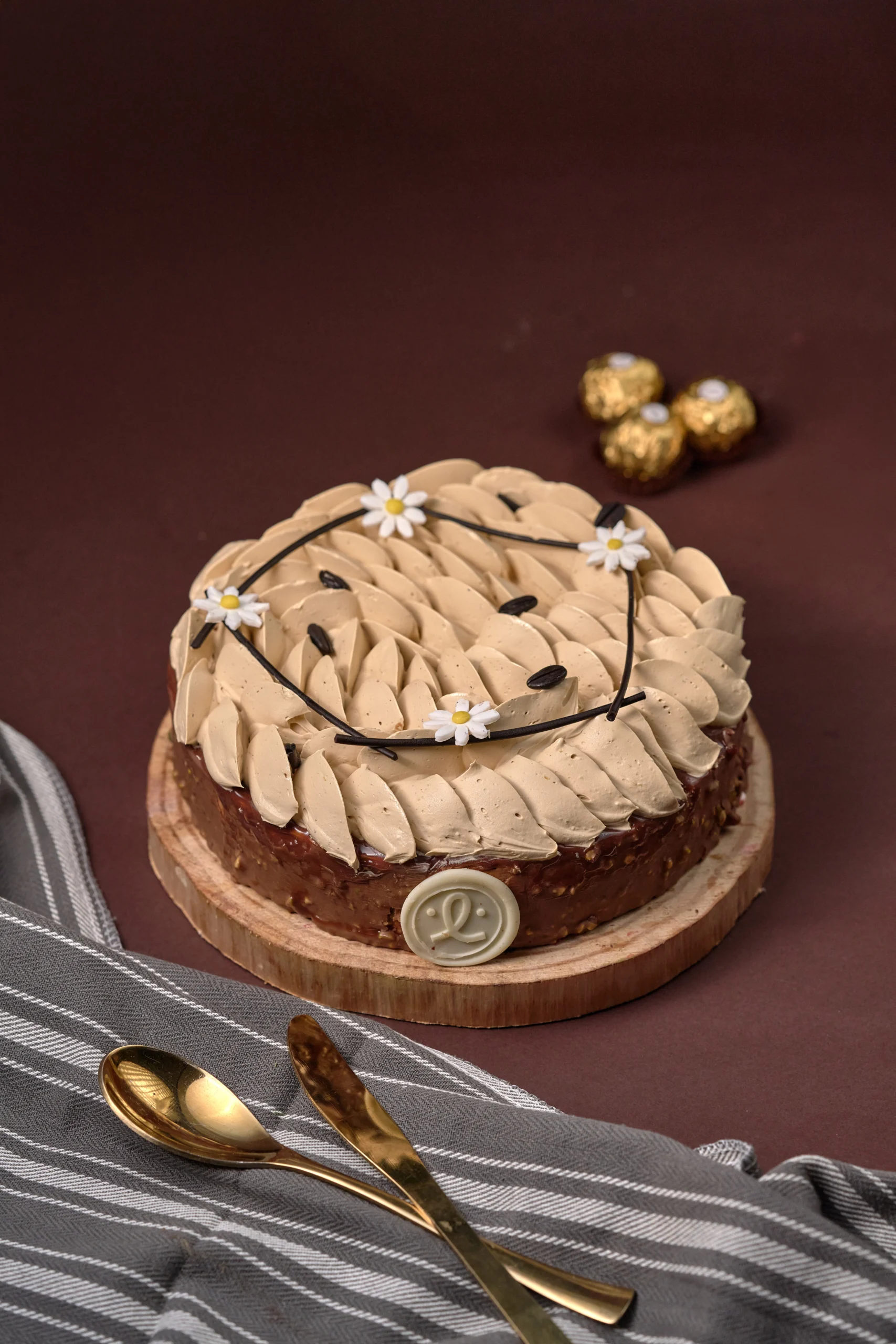 Armand butter cream cake layered with 46.8% Belgium dark chocolate crux with used in dry peanut and a light whipped cream infused with single origin coffee. A morden (Rich gold) Reinterpretation of the opera Morden Cake
